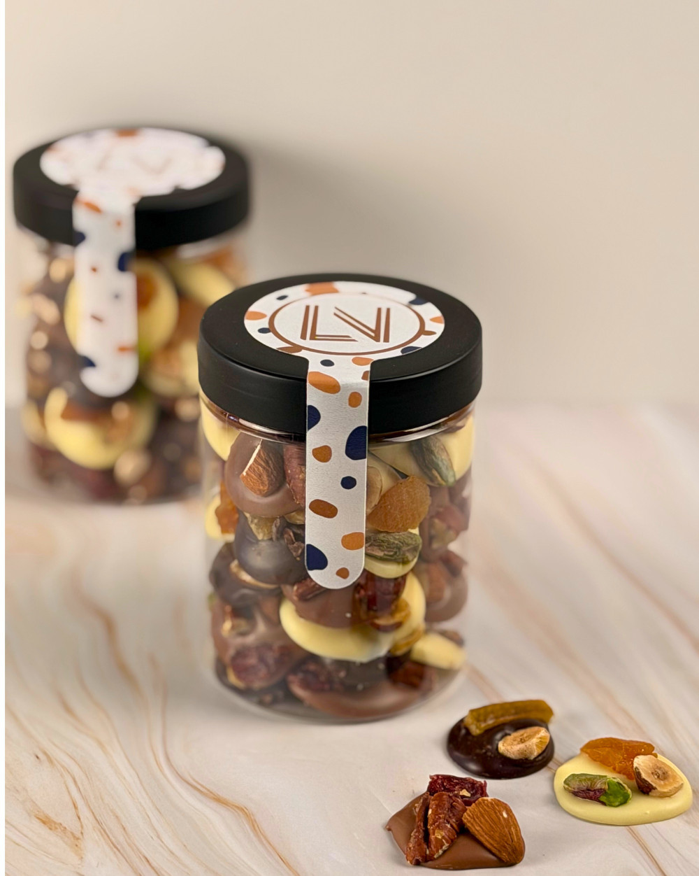Ingrédients : Chocolat de couverture au LAIT et Chocolat de couverture noir (Sucre, beurre de cacao, LAIT entier en poudre, fèves de cacao, émulsifiant : lécithine de tournesol, extrait naturel de vanille), AMANDE, NOISETTE, NOIX DE PÉCAN et PISTACHE, Chocolat blanc (Sucre, beurre de cacao, lait entier en poudre, inuline, lactoserum en poudre, emulsifiant : lecithine de soja, arôme naturel de vanille), Abricots secs (Abricot sec, antioxydant : ANHYDRIDE SULFUREUX), Cranberries séchées (Cranberries, sucre de canne, huile de tournesol), Grué de cacao, Lamelles d'écorces d'oranges confites (Écorces d'orange, sucre, sirop de glucose).